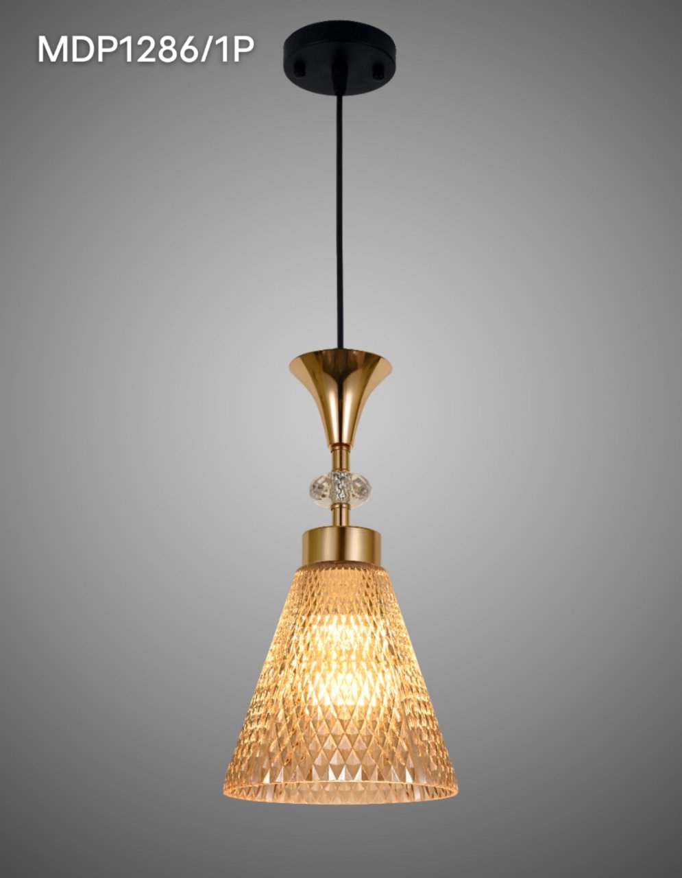Ce luminaire est le luminaire suspendu MDP1286-3P une pièce de style moderne/art-déco originaire d’Italie. Il se caractérise par trois abat-jours coniques en verre ambré texturé, suspendus à des hauteurs différentes depuis une base circulaire noire.